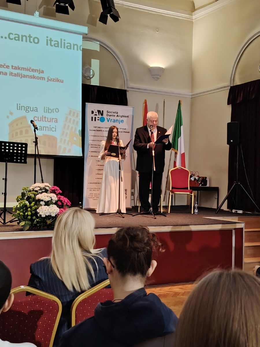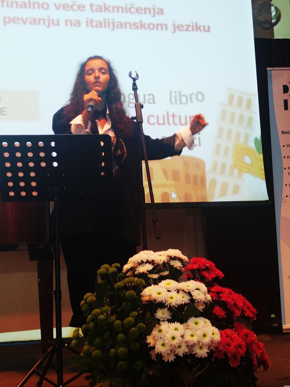 Одржано такмичење део је званичног програма Амбасаде Италије поводом манифестације „Недеља италијанског језика у свету“, која се ове године обележава од 13. до 19. октобра. Током ове недеље, као гости Врањске гимназије, у нашем граду бораве ученици са професоркама из Алтамуре, из школе са којом се наша Гимназија побратимила, захваљујући сарадњи са Удружењем „Данте Алигијери“ у Врању. Учешће у такмичењу у певању на једном од најлепших и најмелодиознијих језика на свету део је и богатог програма који је припремљен у част доласка гостију из Италије.